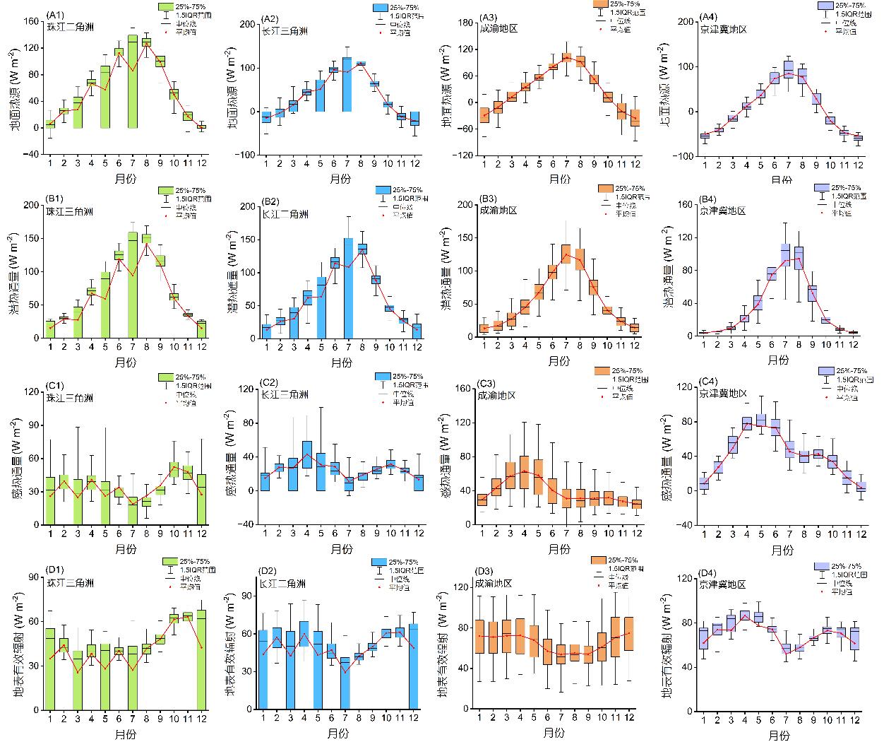 研究表明,四個城市群的地面熱源均呈現(xiàn)“夏強冬弱”的季節(jié)性特征,區(qū)域分布差異顯著。珠三角熱源強度最強,但存在局部低值區(qū);長三角熱源高值主要沿江分布,大城市熱源相對偏低;成渝地區(qū)熱源高值集中于盆地西部,且波動較大;京津冀地區(qū)則表現(xiàn)為“南強北弱”的格局,北部冬季易轉(zhuǎn)為熱匯。這些差異反映了地形、氣候條件與城市化水平的綜合調(diào)控作用。