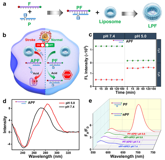 近日,中國(guó)科學(xué)院蘭州化學(xué)物理研究所天然藥物與化學(xué)測(cè)量研究中心海軍研究員團(tuán)隊(duì),基于前期在激活型傳感策略方面系列工作(Sens. Actuators B: Chem.,2025,444,138389;Anal. Chem.,2023,95(6):3525–3531;Anal. Chem.,2022,94(13):5399–5405)的基礎(chǔ)上,首次開(kāi)發(fā)出一種APE1酶激活的比率型pH傳感器。該傳感器巧妙整合了卒中病灶區(qū)并存的局部酸中毒與APE1酶高表達(dá)兩大關(guān)鍵病理特征,構(gòu)建出由二者協(xié)同驅(qū)動(dòng)的“雙重響應(yīng)”智能分子探針,實(shí)現(xiàn)了對(duì)腦卒中的高特異性成像分析。